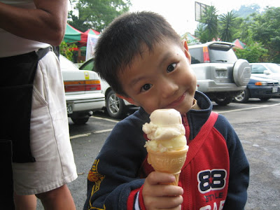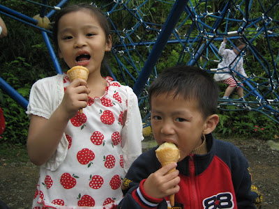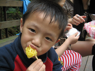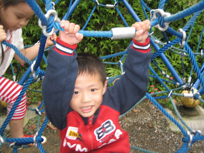 姑姑想帶我去找間店坐,偏偏附近咖啡館客滿,不能讓我好好睡一會兒,於是我又被吵醒,姑姑一見我醒了就帶我們衝上桐花公園,帶我去爬繩索和吊橋,玩累了就坐在廣場休息並吃鳳梨和餅乾....